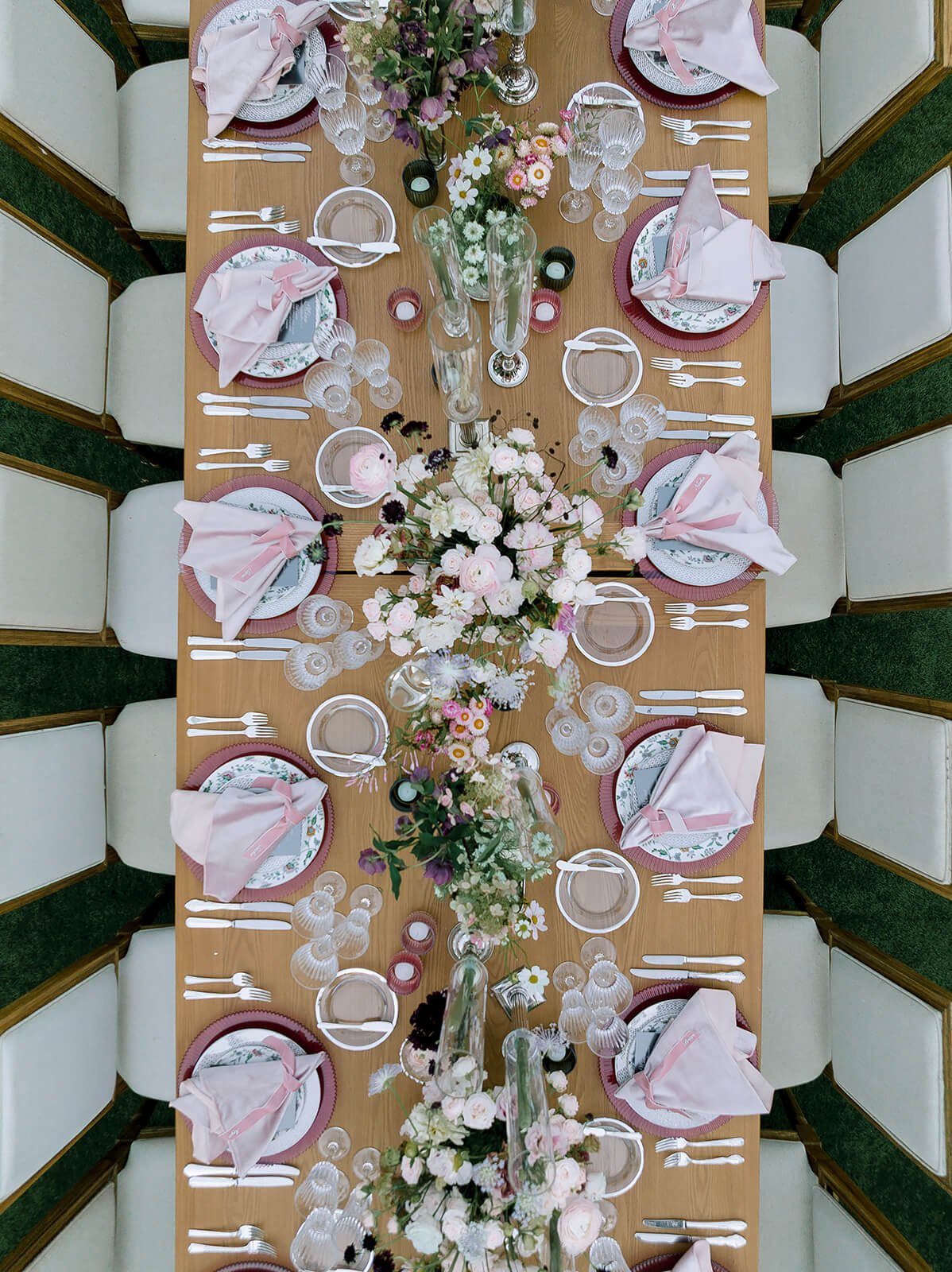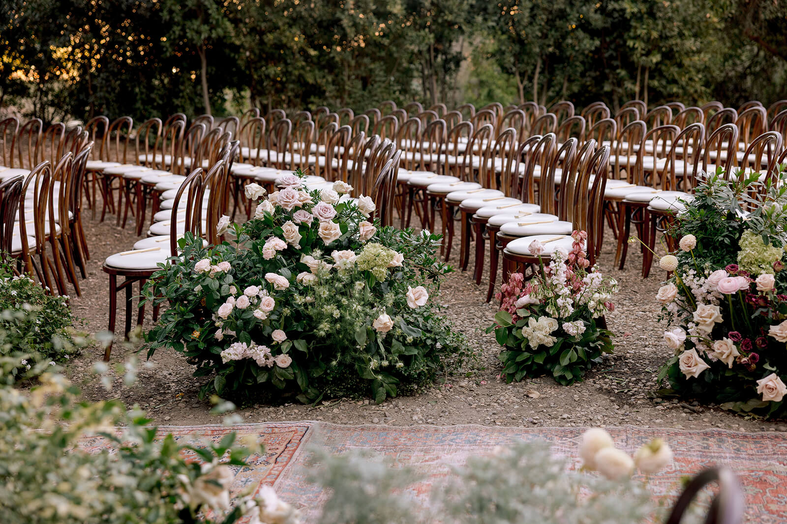 The ceremony began with an intimate “I do” moment atop our custom-fabricated platform, framed by perfectly aligned Bentwood Thonet Chairs in Walnut. Guests then moved into an enchanting open-air reception, where rustic-meets-modern tablescapes featured Cambria Chairs in natural linen and driftwood, etched Barca Glassware, Flora Bella dinnerware, Marcella Gold flatware, and Velluto napkins in Pink Quartz.