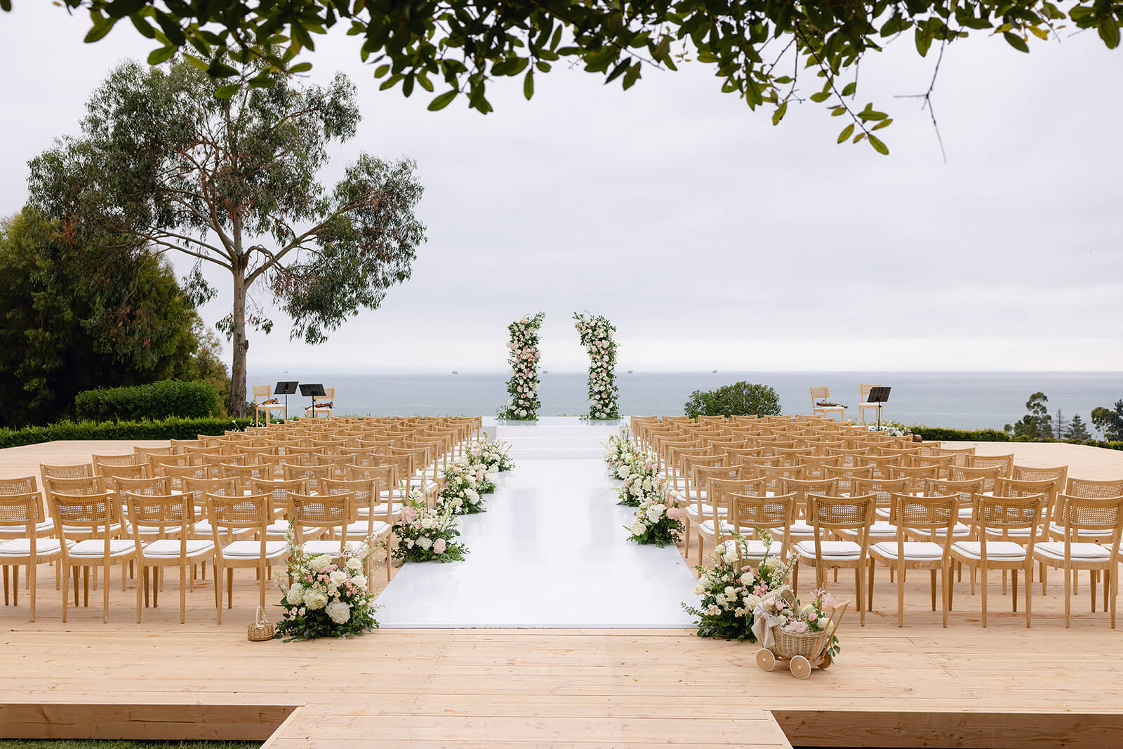 An oceanfront ceremony unfolds in an enchanting open-air setting, where soft waves and natural beauty set a serene tone. Guests are welcomed by a custom subfloor of natural blonde wood planks — an elegant foundation that carries through the entire event.
