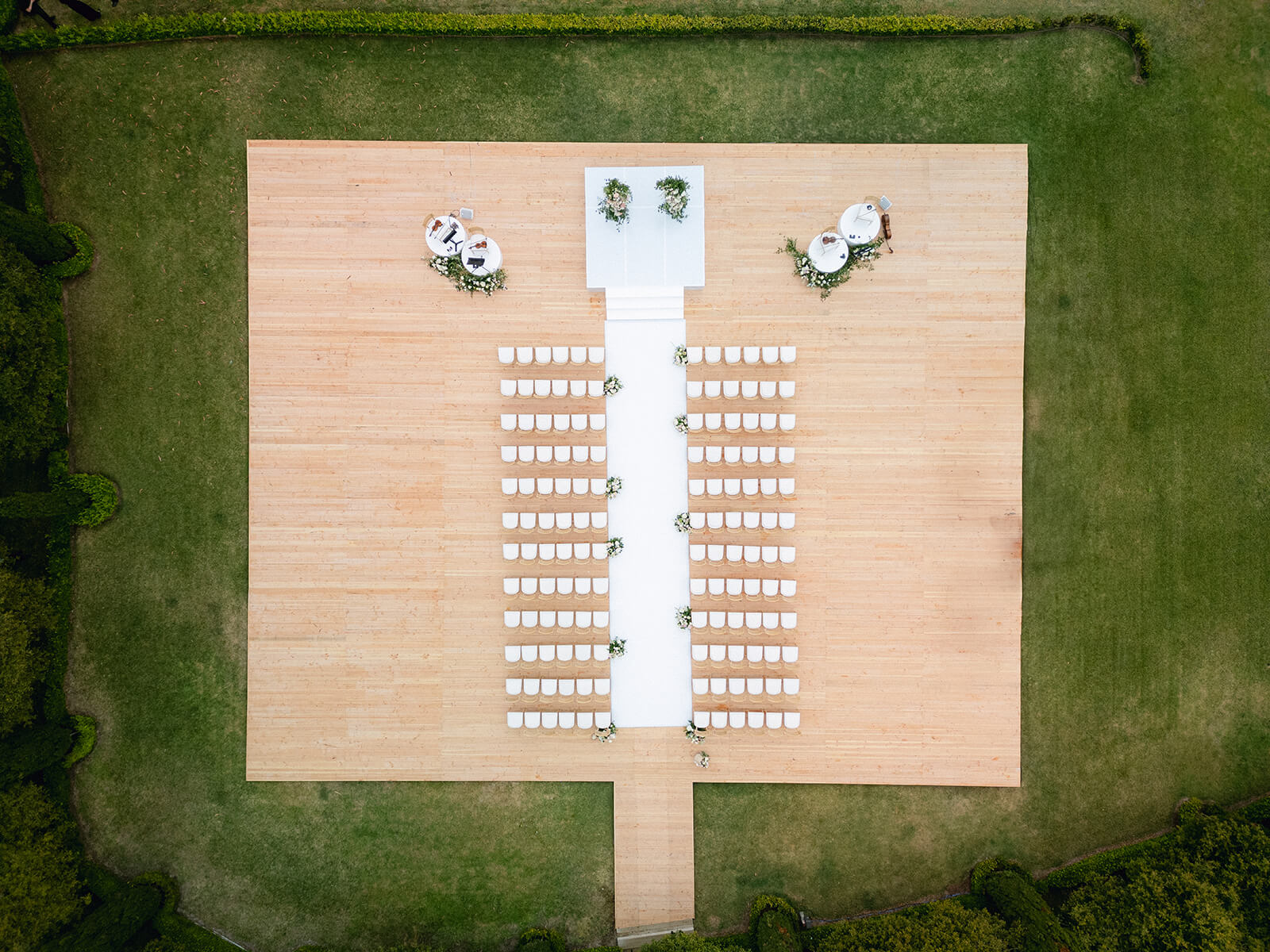 From ceremony to celebration, every detail is intentionally designed. Guests transition along the same blonde wood pathway, guiding them effortlessly toward the dinner reception — a beautiful journey that feels as thoughtful as it looks.
