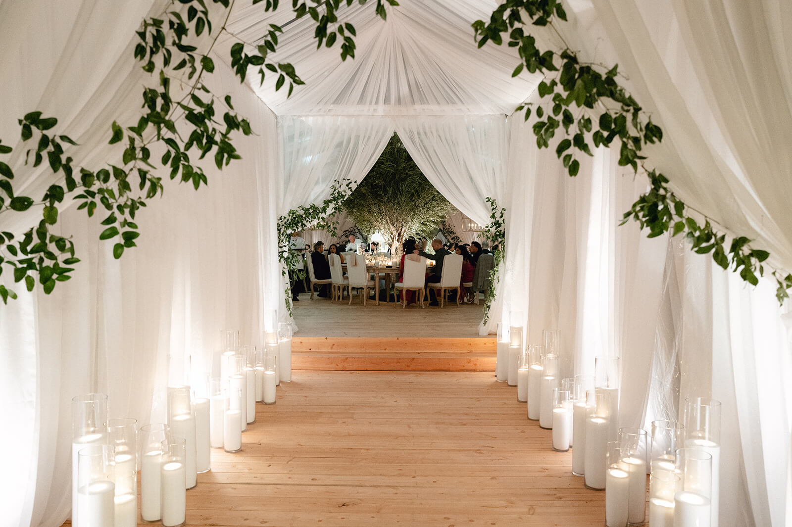 A tunnel draped in flowing chiffon creates a moment of awe as guests enter the reception space. The soft movement of the fabric, combined with coastal views and evening light, sets the stage for a truly unforgettable reveal.