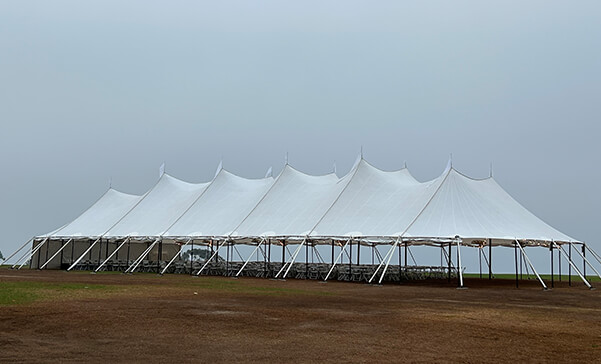 The Tidewater Tent features sculpted peaks and eaves made of translucent sailcloth, to enhance daytime events with warm natural light and create a bright glow for evening gatherings. Its elegant design is accentuated by decorative wood-wrapped perimeter and center poles, making this tent a unique and stylish choice.